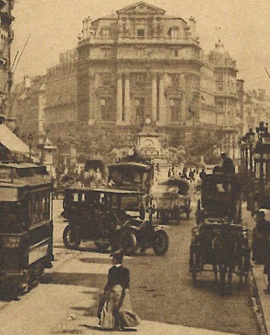 ロダンのカリアティードが設置されている当時のブリュッセルの街並みを窺わせる写真はないのでしょうか。今回改めて探索し始めてから、絵葉書の存在に気づきました。当時のアンスパック大通りはブリュッセルの中心街でもあり、活気ある様子を伝えるものが多数残されており、中古品市場で入手することが可能です。それらに当たれば、ロダン作品が写り込んでいるものもあるはず。そう思って捜索してみると、目論見どおりに幾つかの絵葉書が見つかりました。