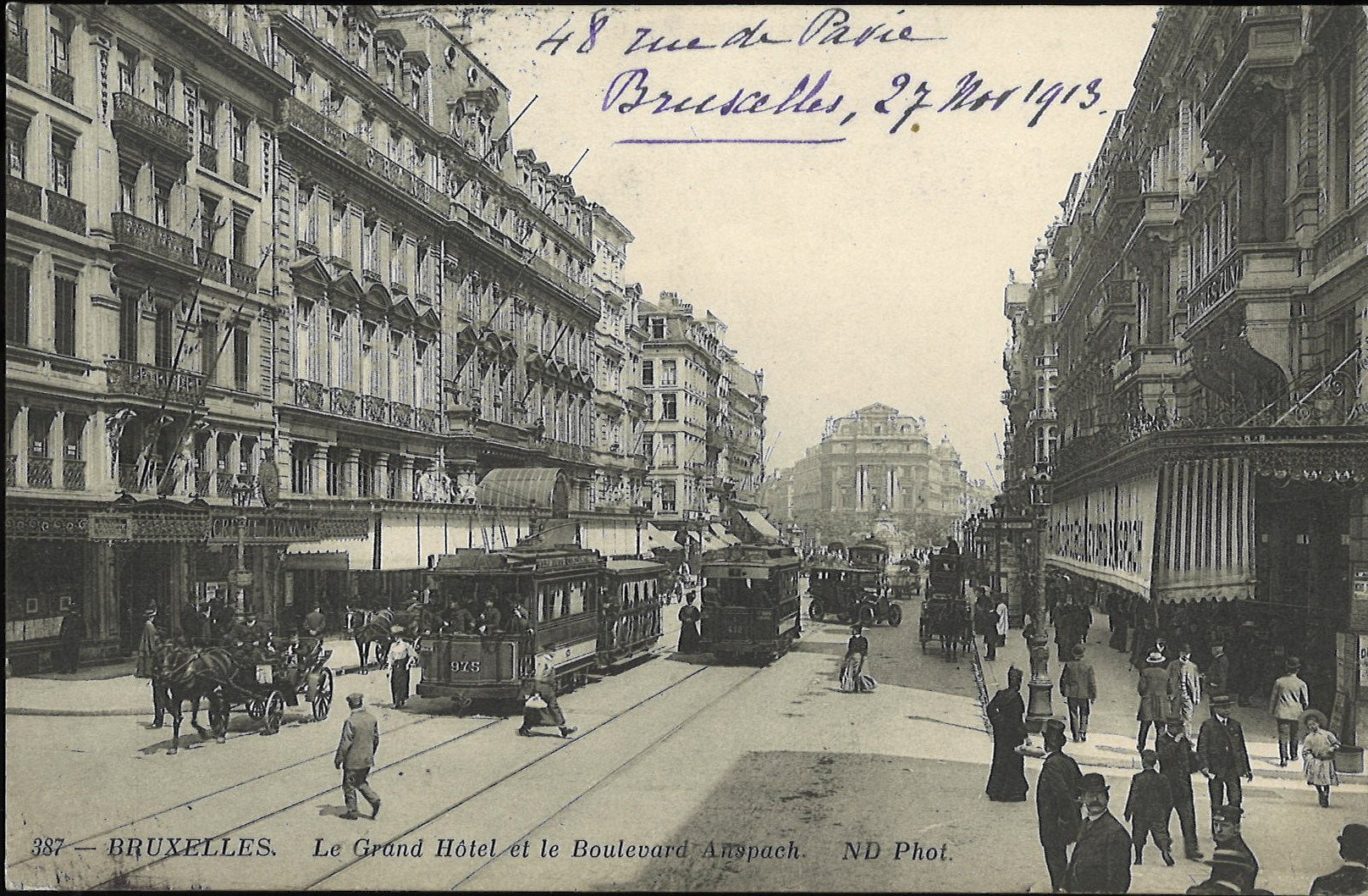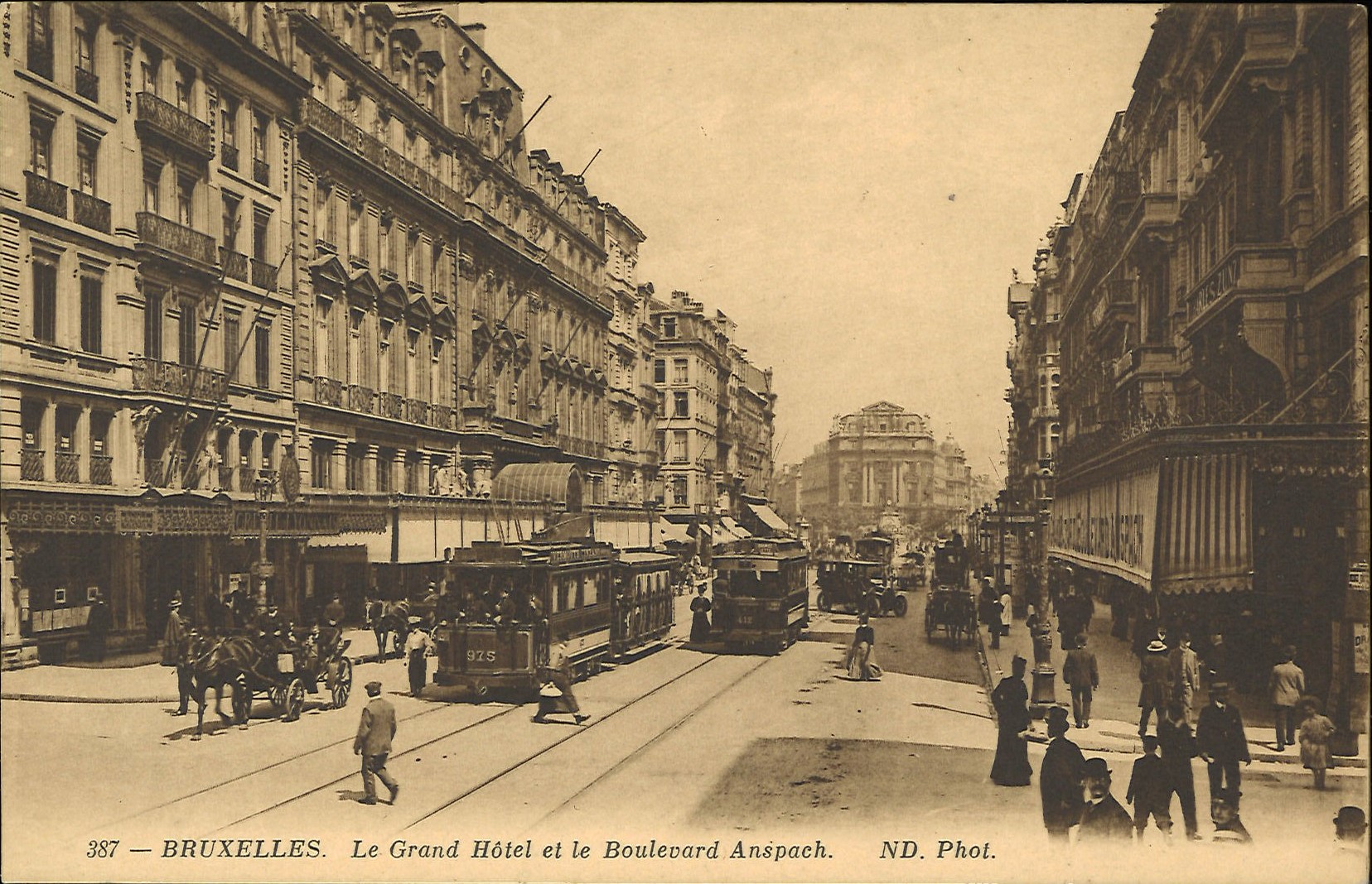 絵葉書に戻りますが、下部の説明には「ブリュッセル ル・グランド・ホテルとアンスパック大通り」と記され、ロダン作品のある33-35番地の建物に隣接するホテルのほうが主題になっています。当時の宿泊者もしくは観光客に向けた一過性の商品だったかもしれませんが、今となっては、過ぎし日の街の姿を伝える貴重な情報源です。大通りの反対側の建物や道行く人々の様子も活き活きと窺え、通りに落ちている影の向きを考えれば撮影時間が推測できますし、それらの長さまで分析すれば季節までも特定できそうです。なんだか、その時代を旅行している気分になります。