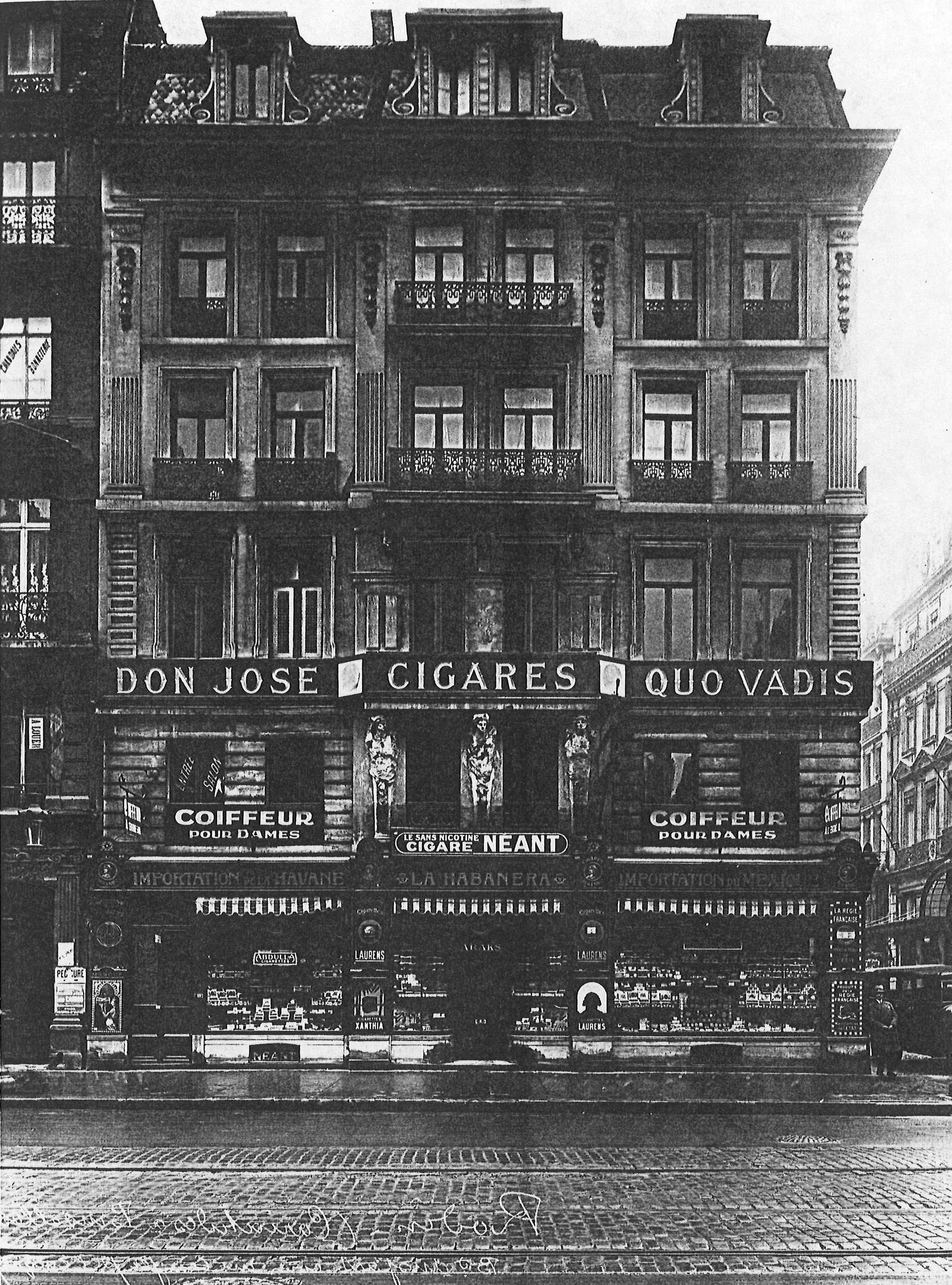 ただ、前稿で紹介した写真図版の建物ではないことにすぐに気がつくと思います[図3]。先の図版では、建物に向かって右側にはグレトリー街が通っていますが、今回紹介する絵葉書では、建物が連なっています。ここで思い出してほしいのは、最初に引用したピエロンの文章にあるとおりで、交差点の両角の建物に計6体の作品があったということ。即ち、3体一組の作品は2対ありました。今回紹介している絵葉書は、アンスパック大通り33-35番地の建物が写り込んでいるものなのです。因みに、こちらの絵葉書に見える33-35番地の3体は第二次世界大戦を乗り越えて残存していたのですが、1953年に建物を改築する際、解体作業で大きな損傷を受け、断片としてブリュッセル市建築課に保管されていたそうです。そして、1962年の展覧会に出品されたのですが、その後、保管倉庫の火事により焼失したと言われています。