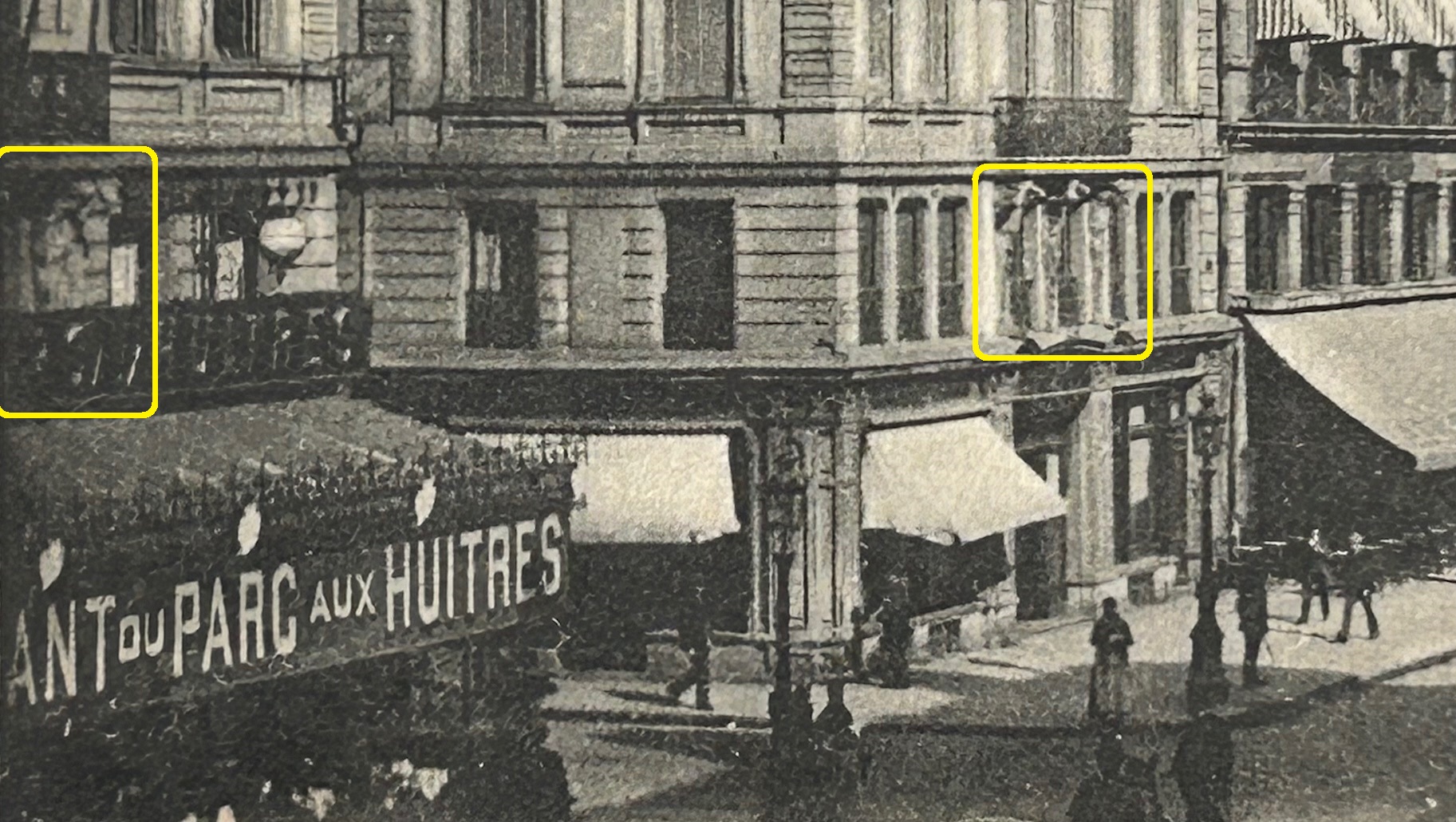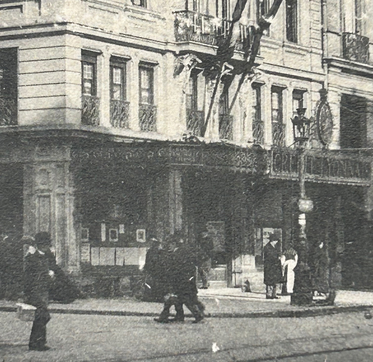 それ以上にこの絵葉書の写真が興味深いのは、33-35番地側の銀行にも、また隣接しているホテルにも、布製かと思われる日除けしか据え付けられていない事実です。道路から見上げた時にロダンの作品を見えにくくしていた、大きなメダイヨンを載せた堅固なアーケードは、まだ設置されていないのです。となると、本稿の前段で紹介してきた絵葉書の写真よりも早い時期の撮影と考えるのが自然に思われます。