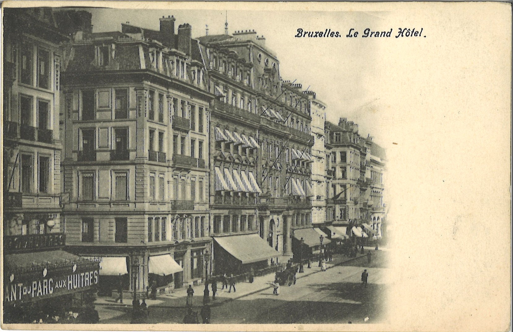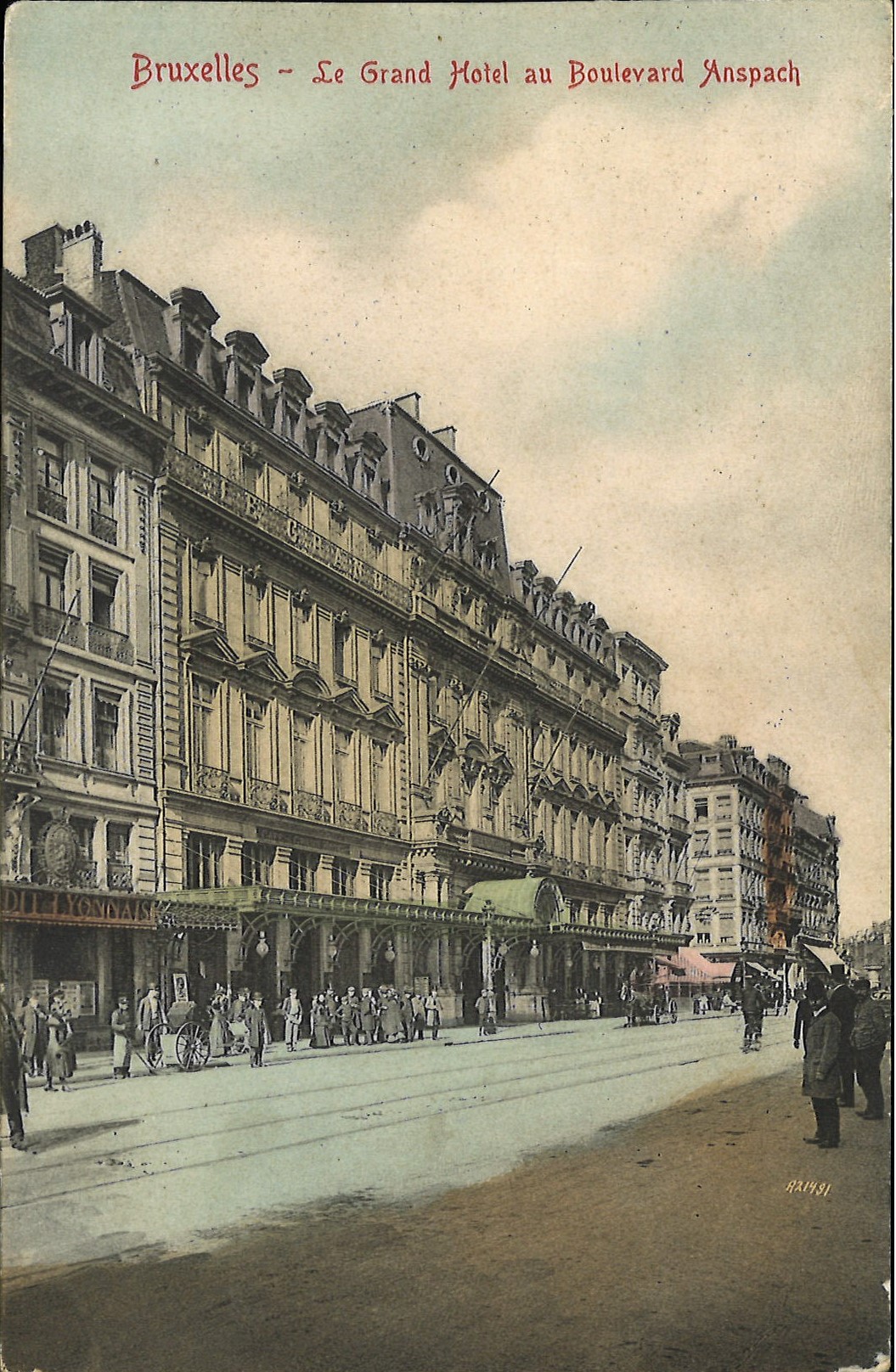 また別の絵葉書も紹介してみます[図5-1]。上部説明には、アールヌーボー風の柔らかな書体で「ブリュッセル―アンスパック大通りのル・グランド・ホテル」とあり、画面は題名どおりにホテルを中心にしています。なので、銀行の建物は左側に一部見えているにすぎないのですが、端にかろうじて1体のアトラントが写り込んでいるのが確認できます[図5-2]。