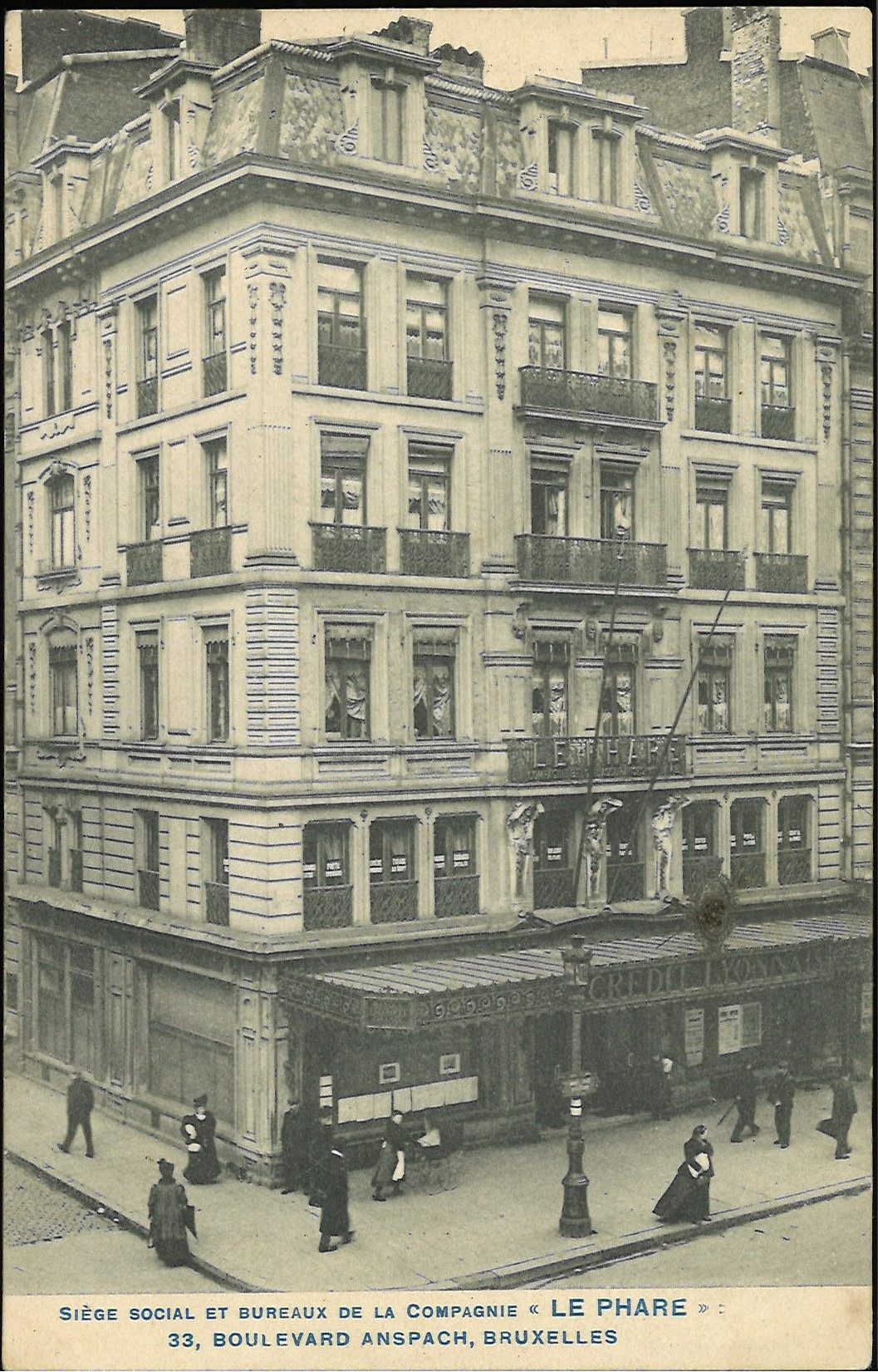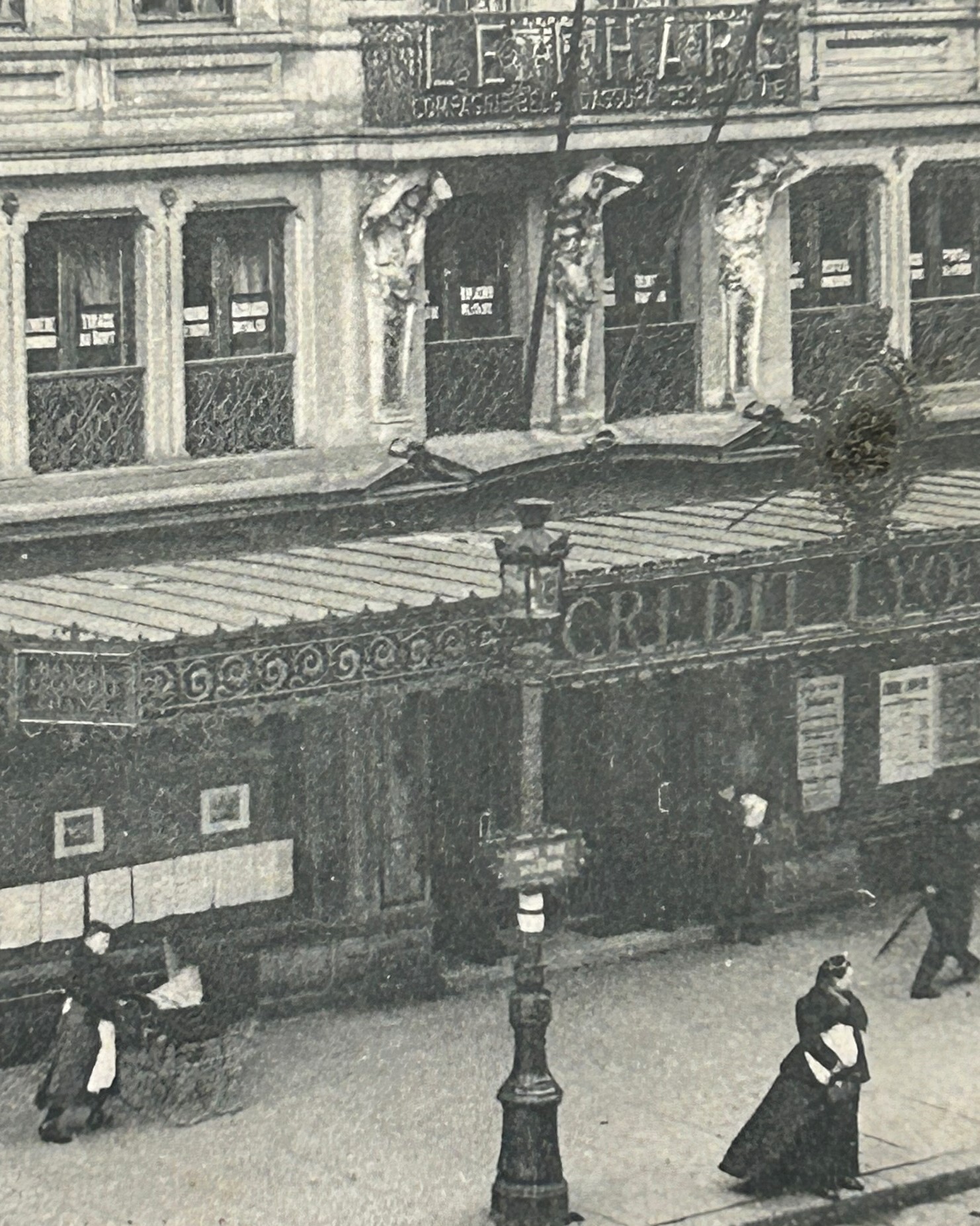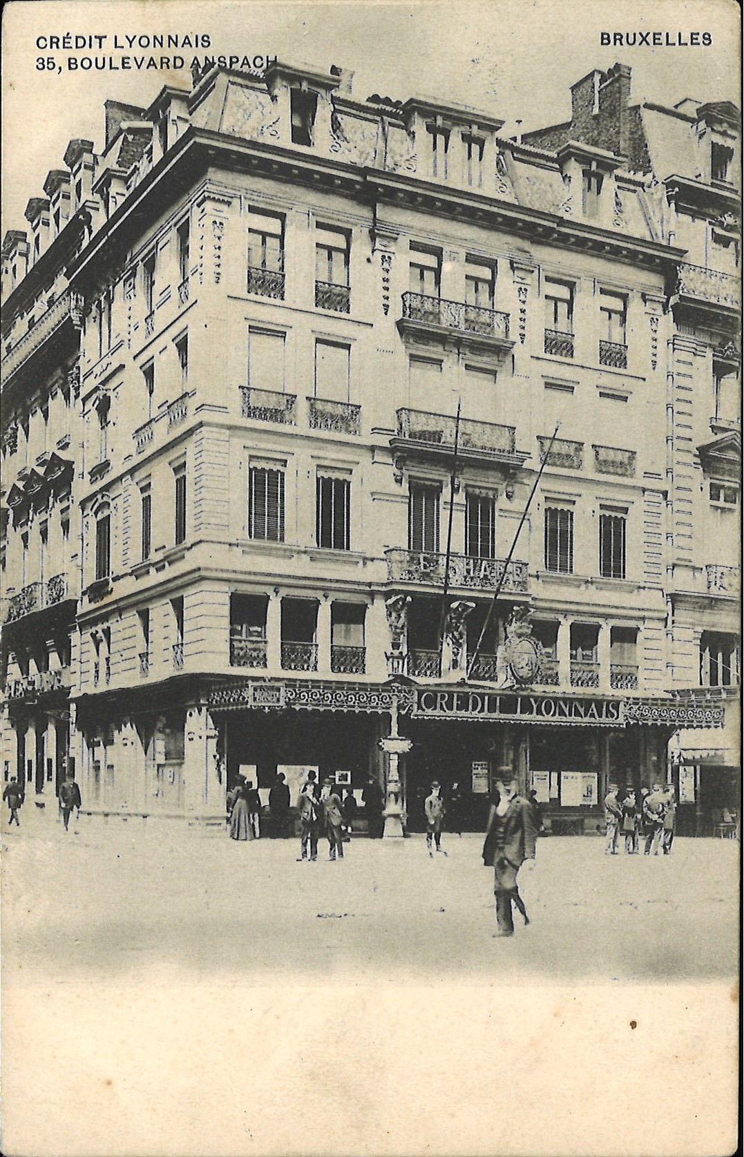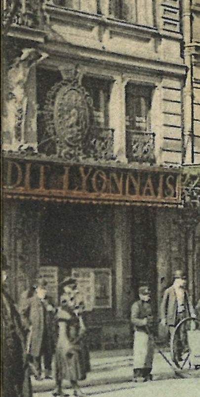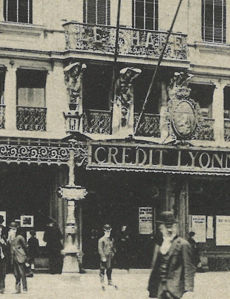 絵葉書の左上説明には「クレディ・リヨネ アンスパック大通り35番地」とあります。アンスパック大通り33-35番地に位置していたのは、フランスを代表する銀行の一つ「クレディ・リヨネ」だったのです。1870年代には意欲的に世界各地へ支店を展開し始めていた金融機関は、ブリュッセルでは新設の大通りに目をつけ、竣工間もない建物で支店の営業を開始したわけです。大通りに向けて張り出したアーケードがあり、しっかりと「CREDIT LYONNAIS(クレディ・リヨネ)」と社名が読めます。その上部中央にはロダンの女性像を遮るかのように、大型のメダイヨンが掲げられています。