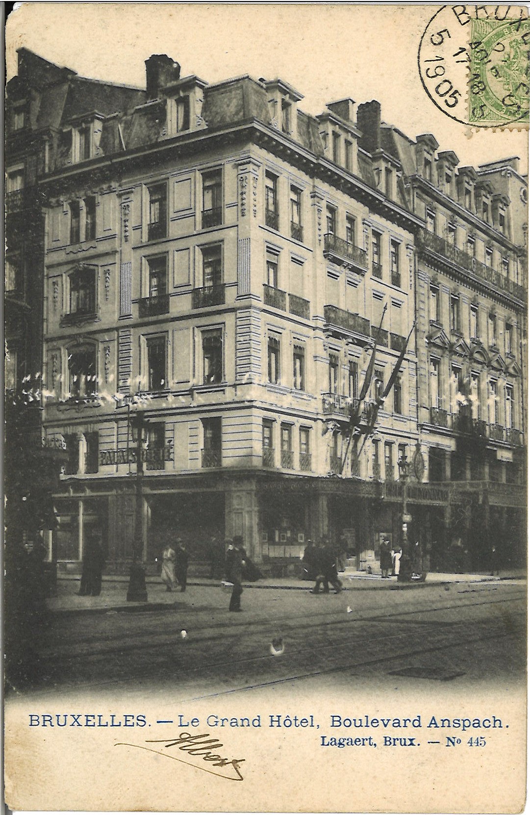 同様の絵葉書がまだありました[図4-1]。説明では「ブリュッセル―ル・グランド・ホテル、アンスパック大通り」となっていますが、明らかに写っている中心は「クレディ・リヨネ」です。こちらの消印も、偶然の一致で1905年でした。拡大してみると、人々の服装も、先ほどの絵葉書の中に見られる人々と大差ないようです[図4-2]。これら絵葉書の元になった写真は同時期の撮影かもしれませんが、確かなことは言えません。