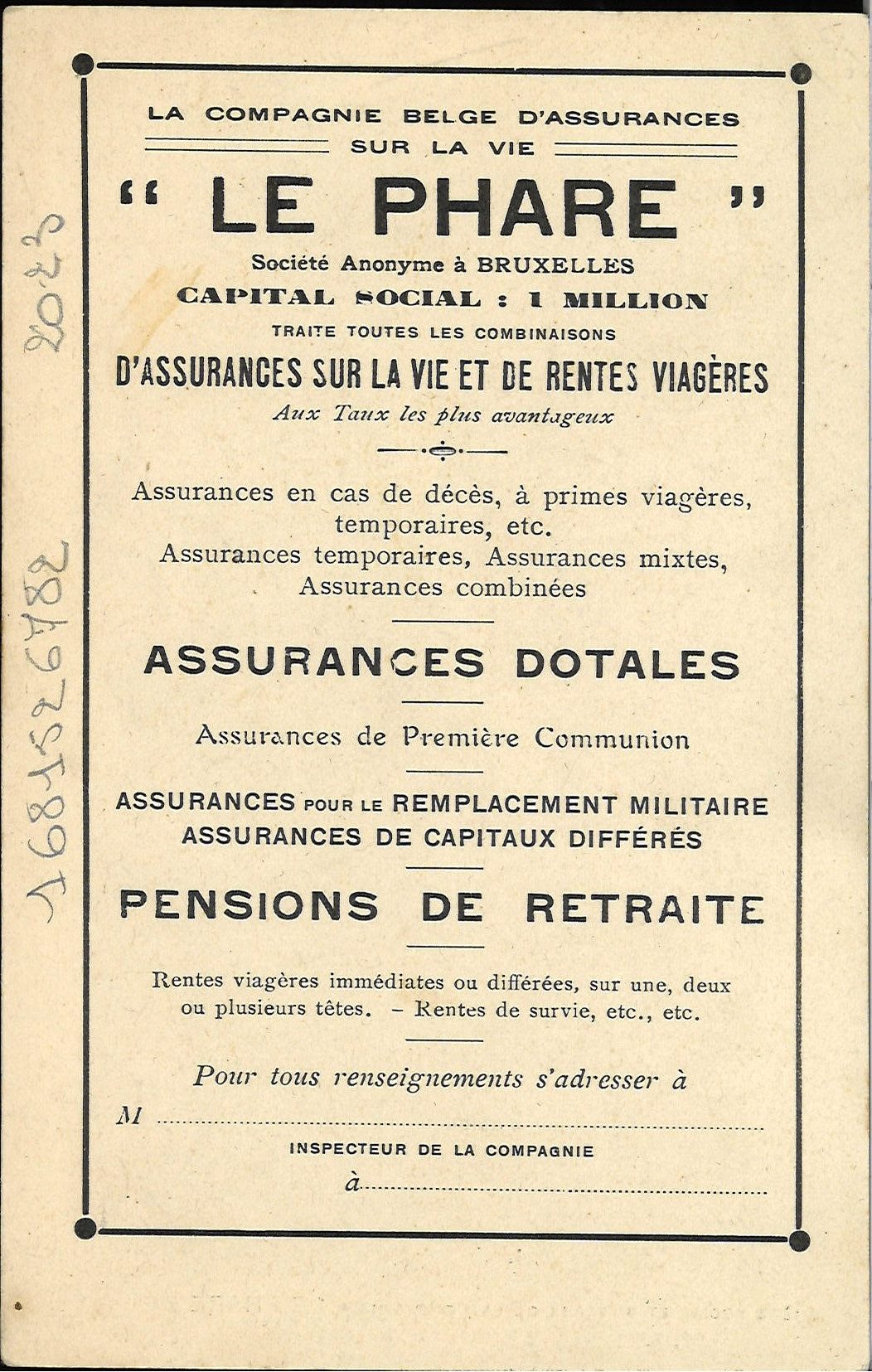 更に探してみると、少しばかり撮影位置の異なるものがありました[図3-1]。こちら、画面下の説明に「ル・ファール [灯台もしくは車のヘッドライトの意]」なる会社の本社事務所と記してありますが、絵葉書ではなく生命保険や年金を取り扱う保険会社の案内のカードでした[図3-2]。顧客の人生行路を明るく照らさん、というのが社名の意図でしょう。先の絵葉書の拡大図でもそうでしたが、カリアティードたちが支えている3階バルコニーに、その社名が大きく読め、その下にも何か書いてあるようです[図3-3]。これら絵葉書の写真の解像度は高く、かなりの拡大に耐え得るのですが、さすがに銀行入口両脇にはある掲示物らしきものの文字情報までは読み取れません。