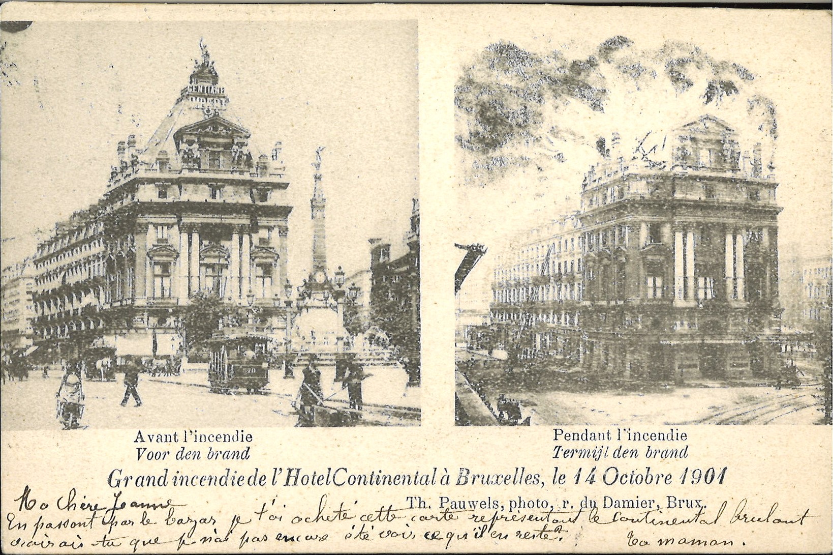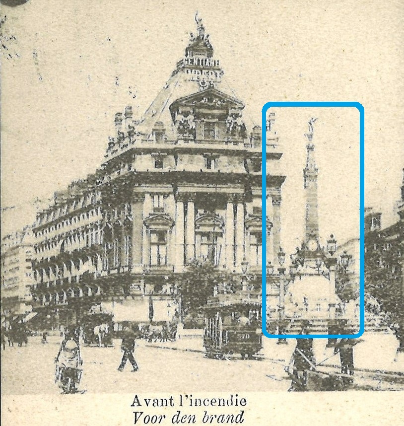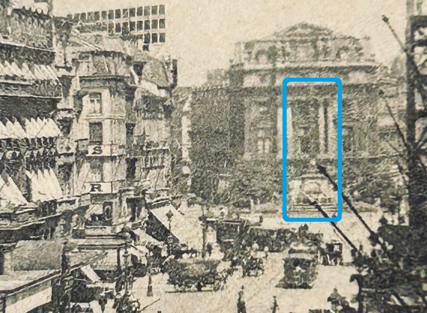 もう一度ホテル・コンティネンタルの火災の絵葉書に戻ります[図1-1]。火災前の様子では、ホテル・コンティネンタルの前に記念碑が立っているのがわかるでしょうか[図1-2]。これは《アンスパック記念碑》と呼ばれているもので、設置されたのは1897年のことでした[英文ウィキペディアによる。現在は市内の別の場所に移設]。つまり、火災前のホテル・コンティネンタルと記念碑が一緒に写っている場合、その写真の撮影時期は、記念碑の建立後で火災前、つまり1897-1901年頃に絞り込むことが可能になります。