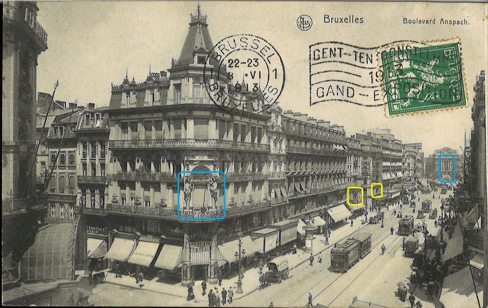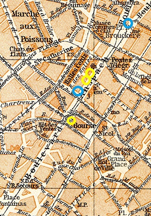 この絵葉書[図2-1]の撮影時期が武石滞在中に重なるのか不明ですが、この写真に見られるように、ディレンスとロダンの作品が共にアンスパック大通りで見られたことは、武石が到着した1902年でも変わりありません[今やロダンの作はありませんが、ディレンスのカリアティードは現存しています]。地図上でも位置関係を確認していただくべく、ネット上にあった1905年のベデカーの地図を加工して示すと次のようになります[図4]。水色の印はディレンスの作品があった場所、黄色はロダンのカリアティードがあったところになります。大通りの中央付近の証券取引所の中にもロダンのカリアティードはありましたし、二人の作以外にも様々な建築装飾をアンスパック大通りでは目にすることができました。彫刻家を目指す者ならば、作品研究を兼ねて散策するのに格好の場所だったのです。