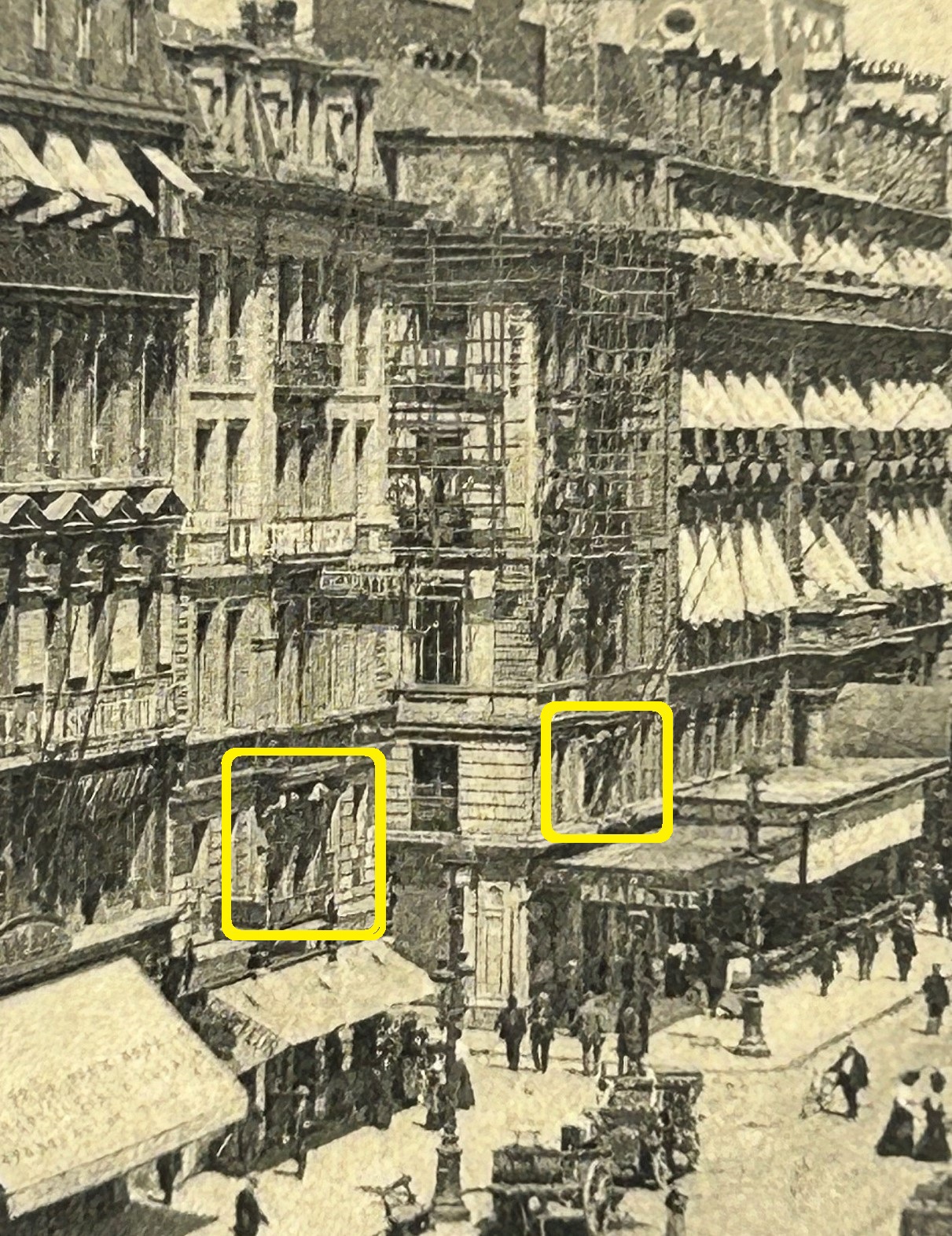 ロダンの作品も確認できますが、興味深いことに、ロダンのカリアティードがある建築2件のうち、銀行があった33-35番地の建物には、上層階に足場が組まれ何やら作業中の様子です[図2-4]。もしかすると、先の第4回目の拙稿(https://kinbi.pref.niigata.lg.jp/topics/column28/)で図4として紹介した絵葉書に見られた、上層階の文字看板[図3]の取り付けだったのかもしれない、というのは手前勝手な推論で、調査が至らず憶測を超えるものではありません。